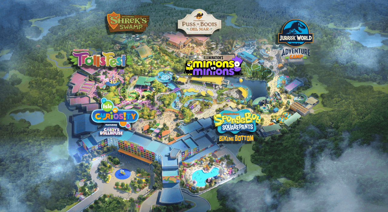 Universal Kids Resort will feature seven themed lands including DreamWorks’ Shrek’s Swamp, Jurassic World Adventure Camp, Nickelodeon’s SpongeBob SquarePants Bikini Bottom, Illumination’s Minions vs. Minions: Bello Bay Club, DreamWorks’ TrollsFest, DreamWorks’ Puss in Boots Del Mar and the Isle of Curiosity.